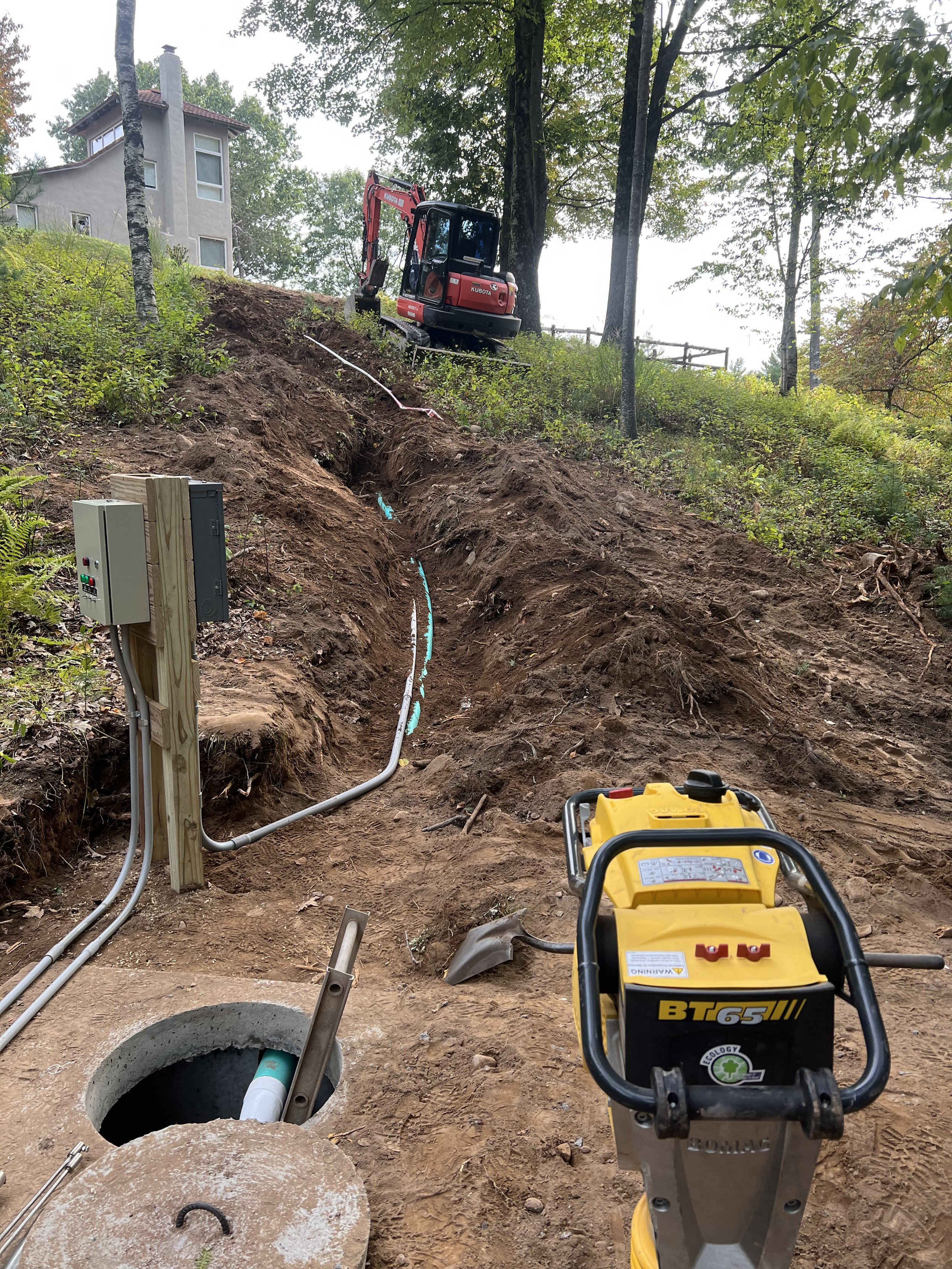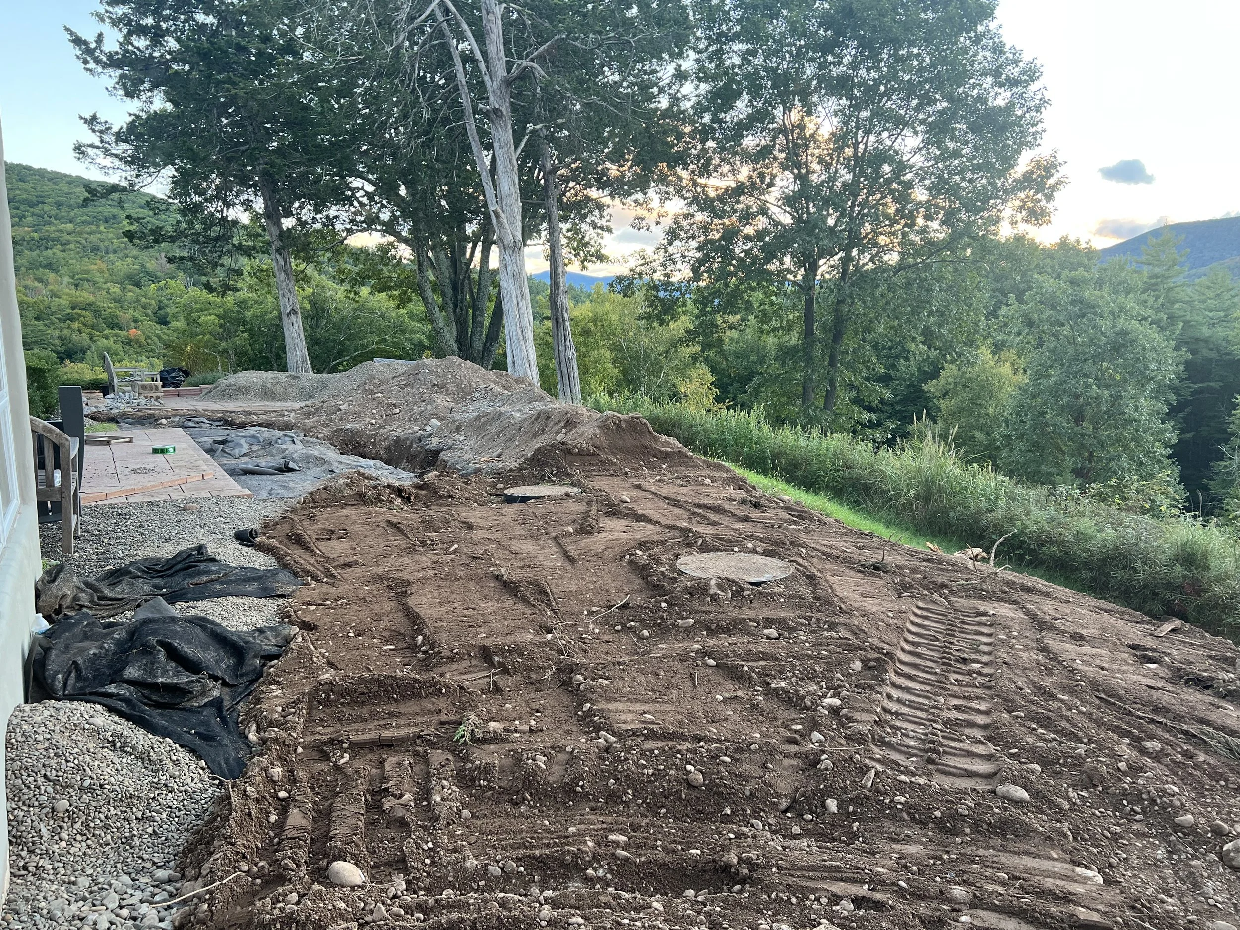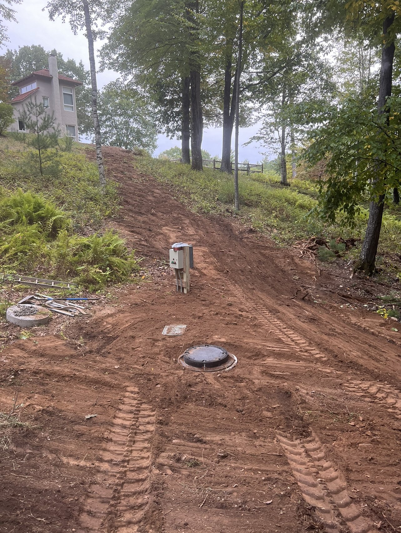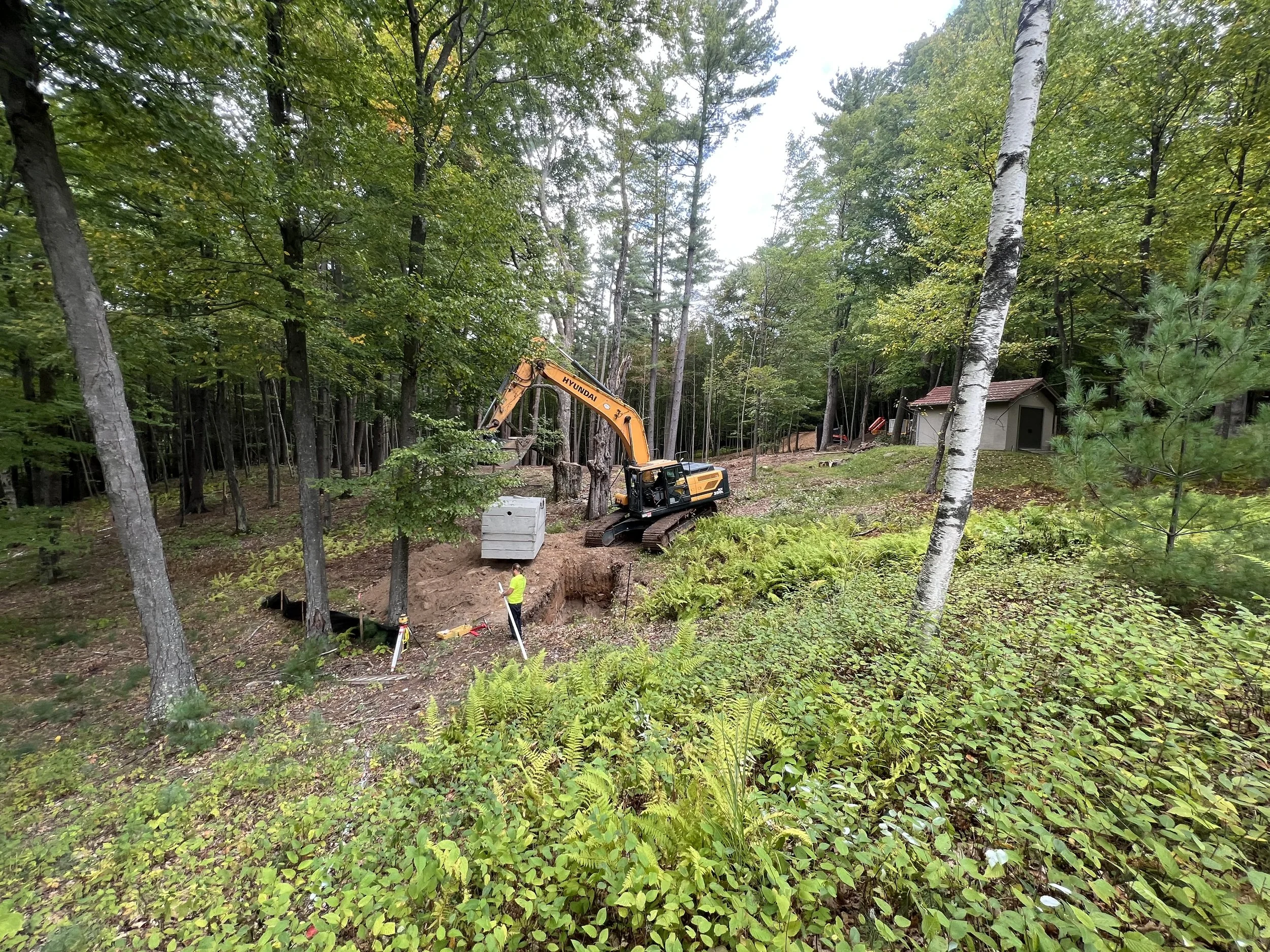 Septic System Installation (Replacement, Start to Finish)2000 Gal Septic Tank, 1500 Gal Pump Chamber/Tank, Manhole, D-Box, Raised Leach Field and Curtain Drain. Partial patio removal with replacement. Site clearing, trees chipped for walking trail.