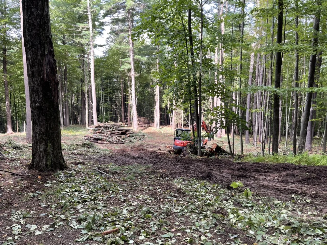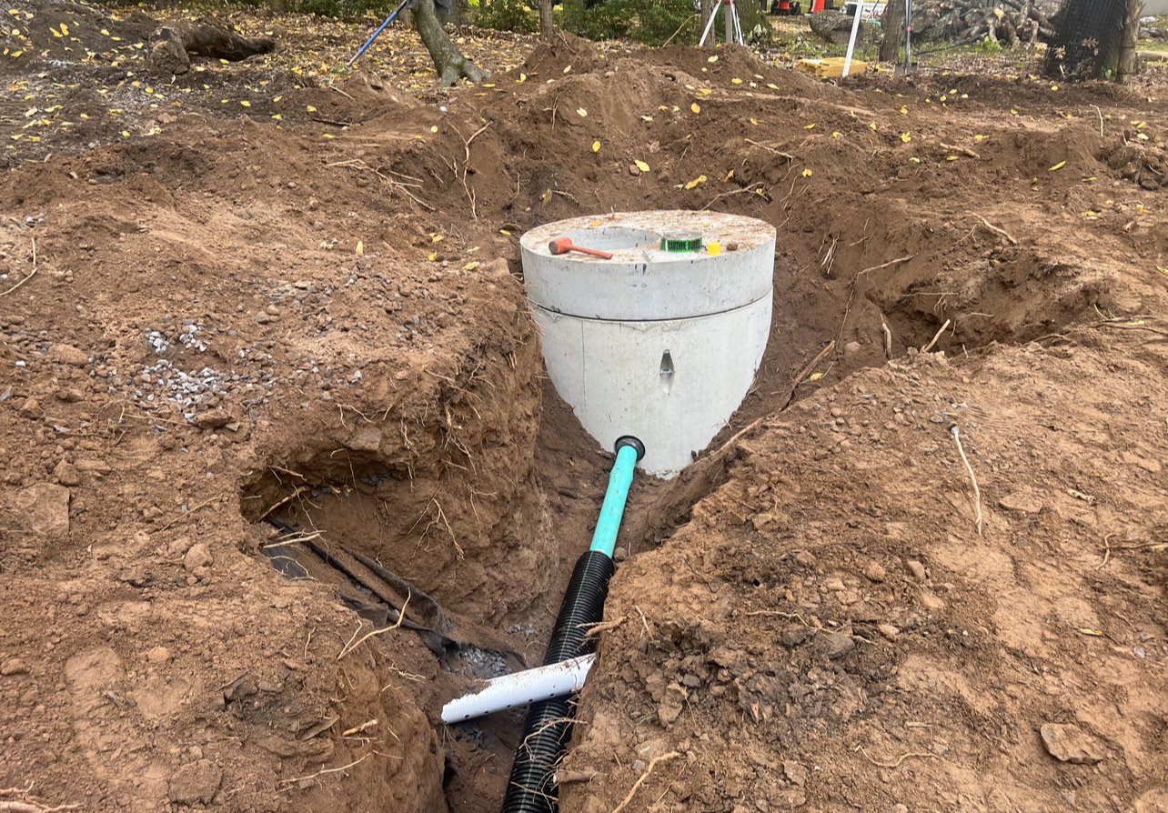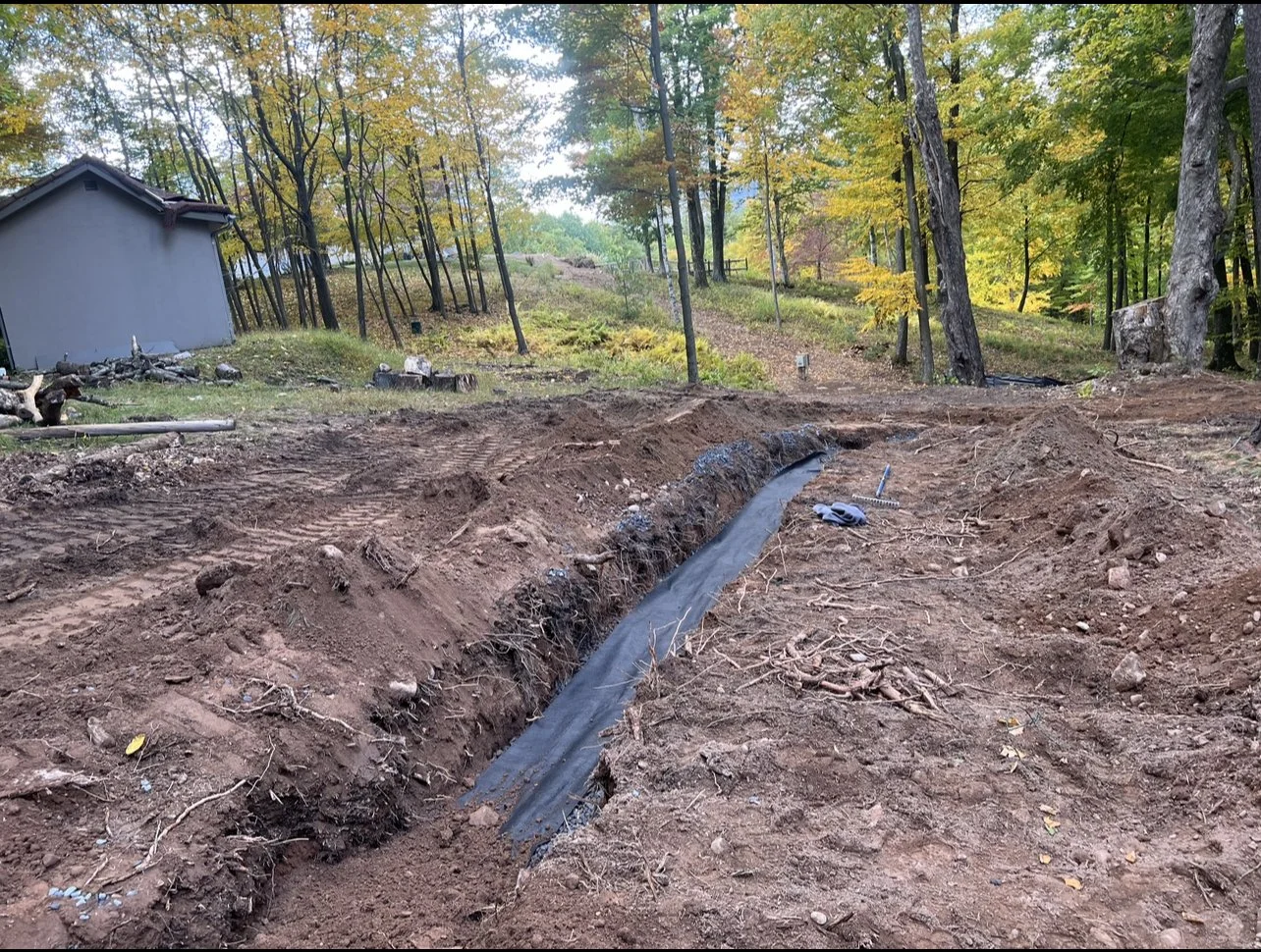 Septic System Installation (Replacement, Start to Finish)2000 Gal Septic Tank, 1500 Gal Pump Chamber/Tank, Manhole, D-Box, Raised Leach Field and Curtain Drain. Partial patio removal with replacement. Site clearing, trees chipped for walking trail.